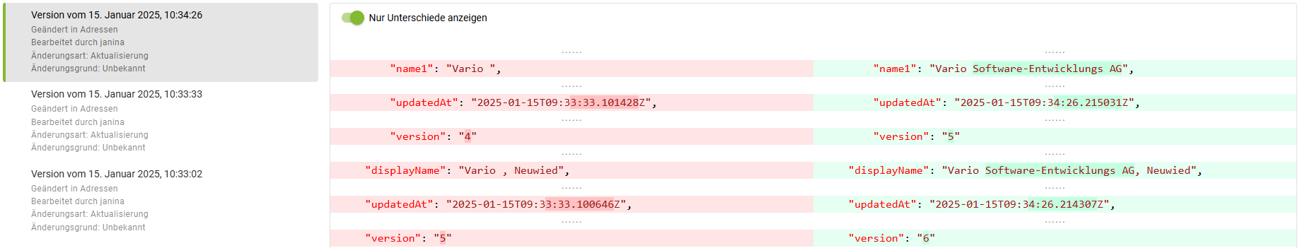 Im Änderungsprotokoll werden auf der linken Seite die **Zeiteinträge** aufgelistet, zu denen Änderungen vorgenommen wurden. In der mittleren Spalte werden die **alten Angaben** in rot und auf der rechten Seite die **neuen Angaben** mit den Änderungen in grün angezeigt.