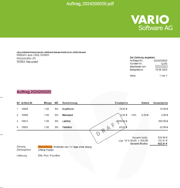 In VARIO Cloud kannst Du Dropdown-Menüs mit selbst **angelegten Einträgen** – etwa zur Auswahl von **Zahlungs- oder Versandarten** – bequem per Tastatur bedienen. Durch **manuelle Eingabe** wird die Auflistung entsprechend gefiltert. Mit der **Eingabetaste** wählst Du den **ersten angezeigten Eintrag** aus, mit der **Tabulatortaste** hingegen den **exakt passenden Wert**. Mit den **Pfeiltasten** navigierst Du zwischen den Einträgen und bestätigst mit der Tabulator- oder Eingabetaste. So kannst Du Eingaben schnell und präzise steuern, ohne die Maus zu verwenden.