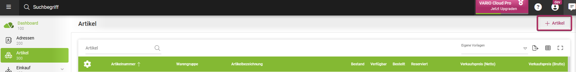 Neue Datensätze lassen sich in den jeweiligen Programmen einheitlich über den Button mit dem “ **+**” Zeichen anlegen, der sich i.d.R in der **rechten oberen Ecke** befindet. Die erfassten Datensätze werden anschließend in einer konfigurierbaren Tabelle dargestellt. Diese bezeichnen wir im Rahmen dieser Online-Hilfe auch als [C-Units](https://help.vario-software.de/vario-cloud-handbuch/grundlagen-and-konzepte/konfigurierbare-tabellen-c-units).