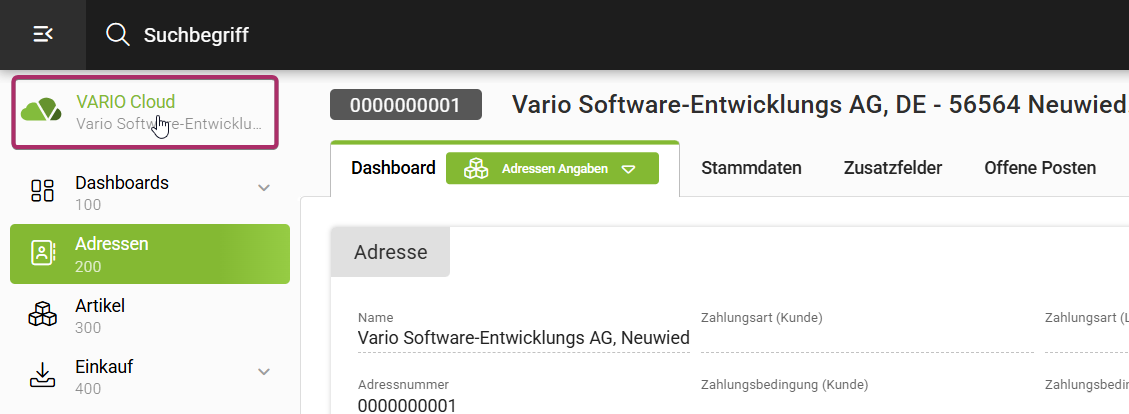 Unabhängig davon, wo Du Dich gerade in VARIO Cloud befindest, kannst Du Deine **eigene Adresse** jederzeit direkt aufrufen. Ein Klick auf das **VARIO Cloud Logo** oben links **über dem Navigationsmenü** genügt, um die **eigene Adresse** im selben Tab zu öffnen. So sparst Du Dir die manuelle Suche im Modul **Adressen**.